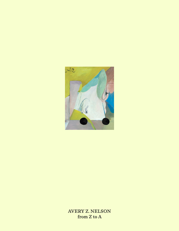 Avery Z. Nelson: from Z to A is the artist's first monograph and includes a significant selection of paintings created between 2018 - 2026. The book includes over 40 pages of color illustrations as well as an essay by Hannah Klemm and an interview between Nelson and Andrew Woolbright. The book was designed by Rosa McElheny and Hilary duPont.