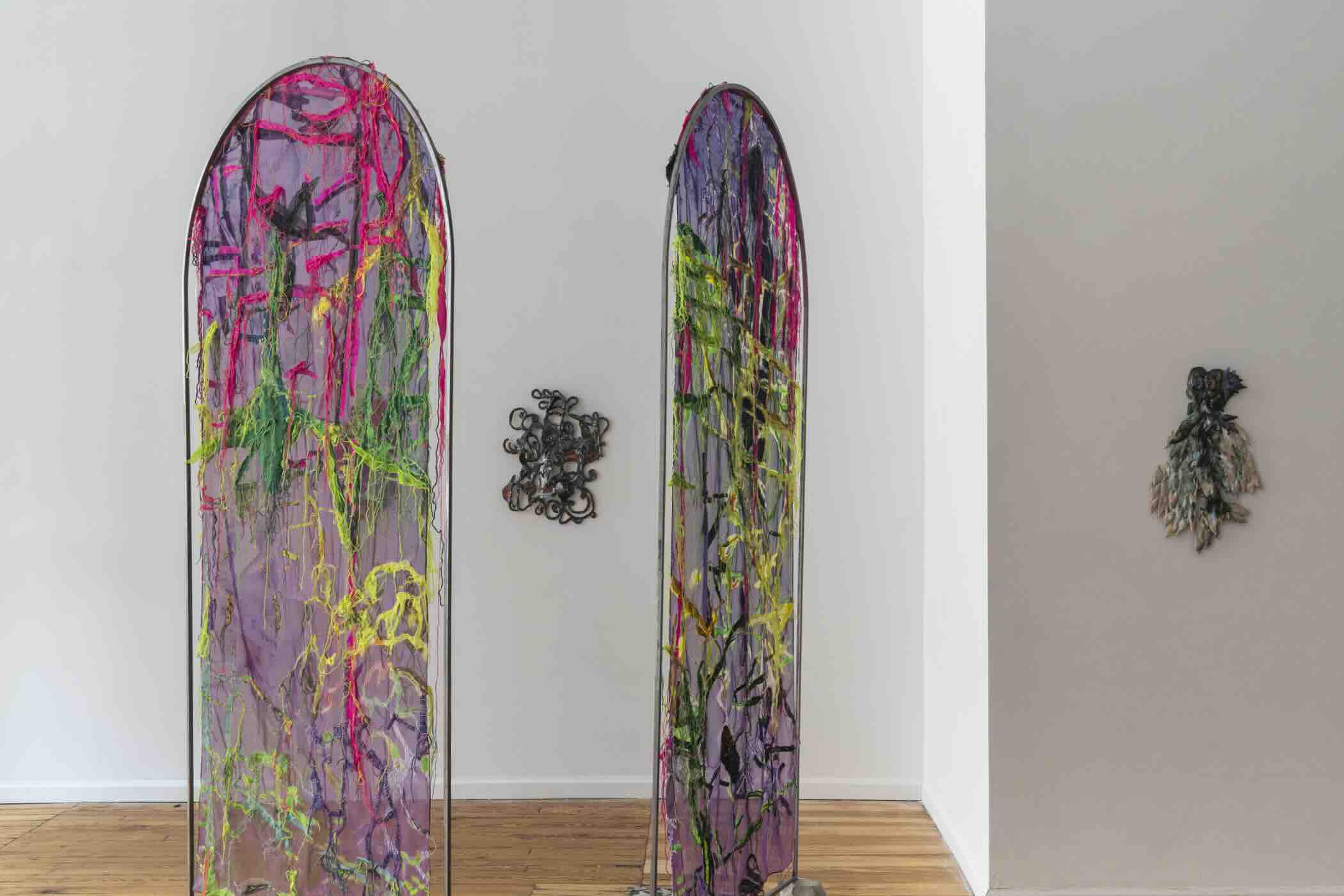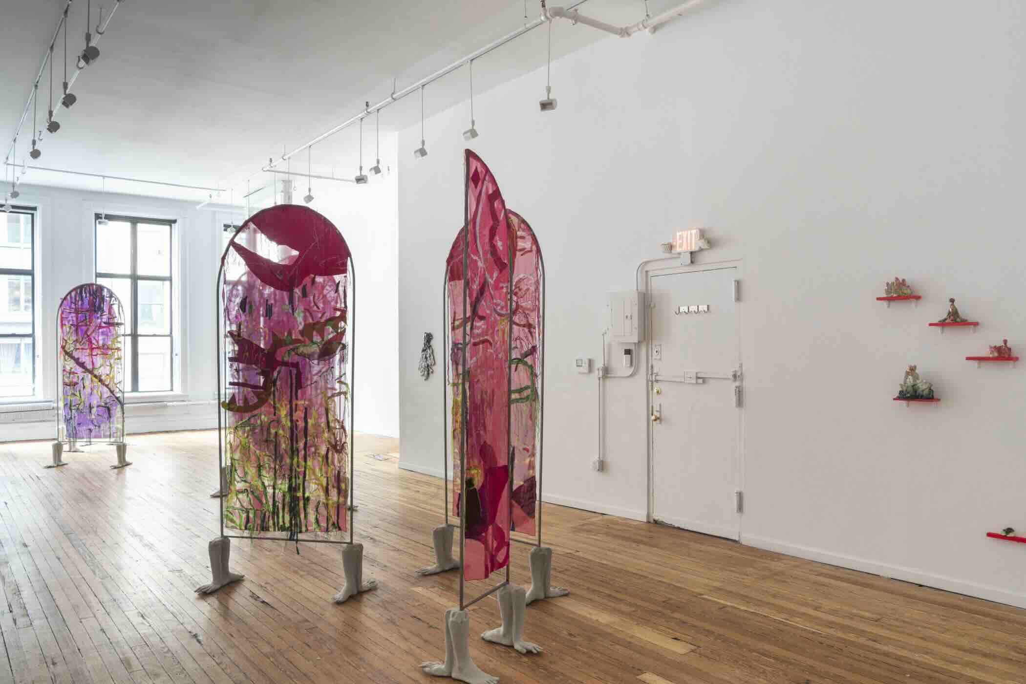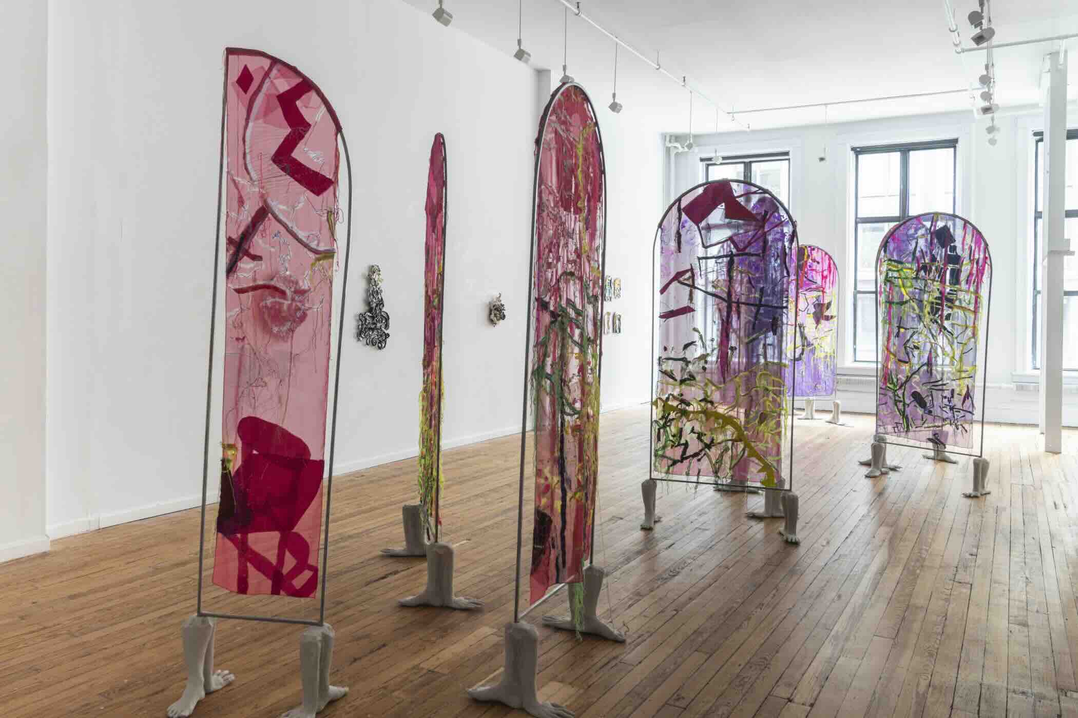 The exhibition is anchored by a major sculpture titled Allegory of Continents (1-10) which is installed down the center of the gallery. The work consists of ten panels of textile, each suspended within an identical steel arch and anchored in concrete casts of the artist’s own hands and feet. The textiles – brilliant hues of Jimenez’s signature pink, semi-transparent, printed and hand-embroidered with geometric patterns – are Jimenez’s cosmograms: two-dimensional fields in which celestial bodies, beliefs systems, precolonial designs, and geographies coexist. These are not maps in the conventional sense, but non-linear spaces whose intention is felt, not navigated.