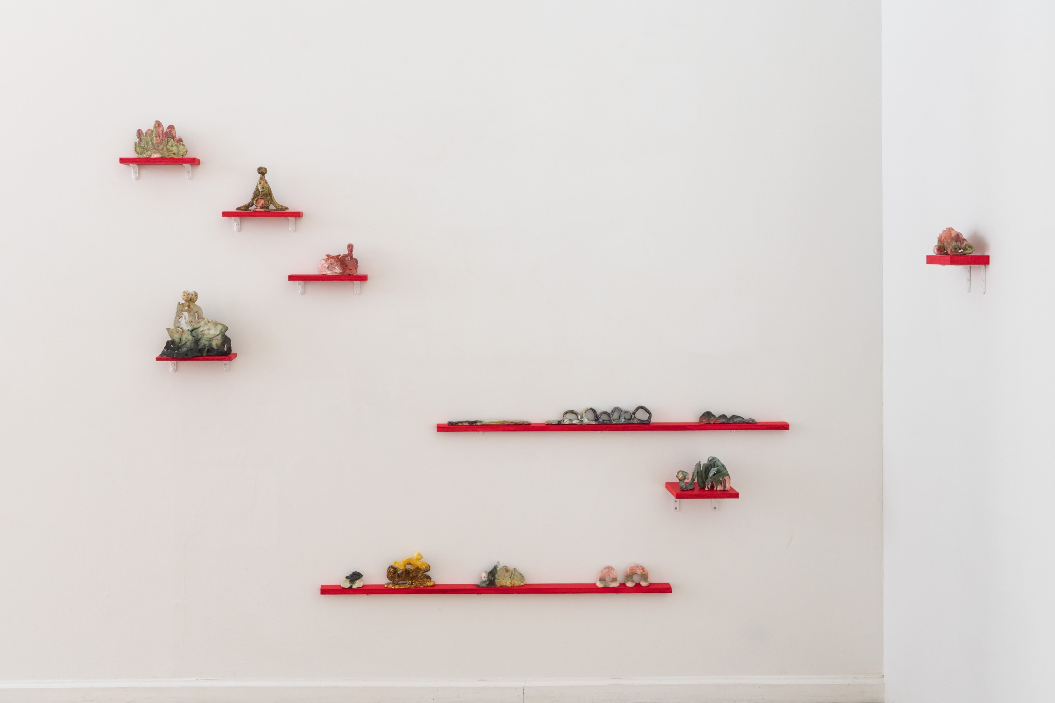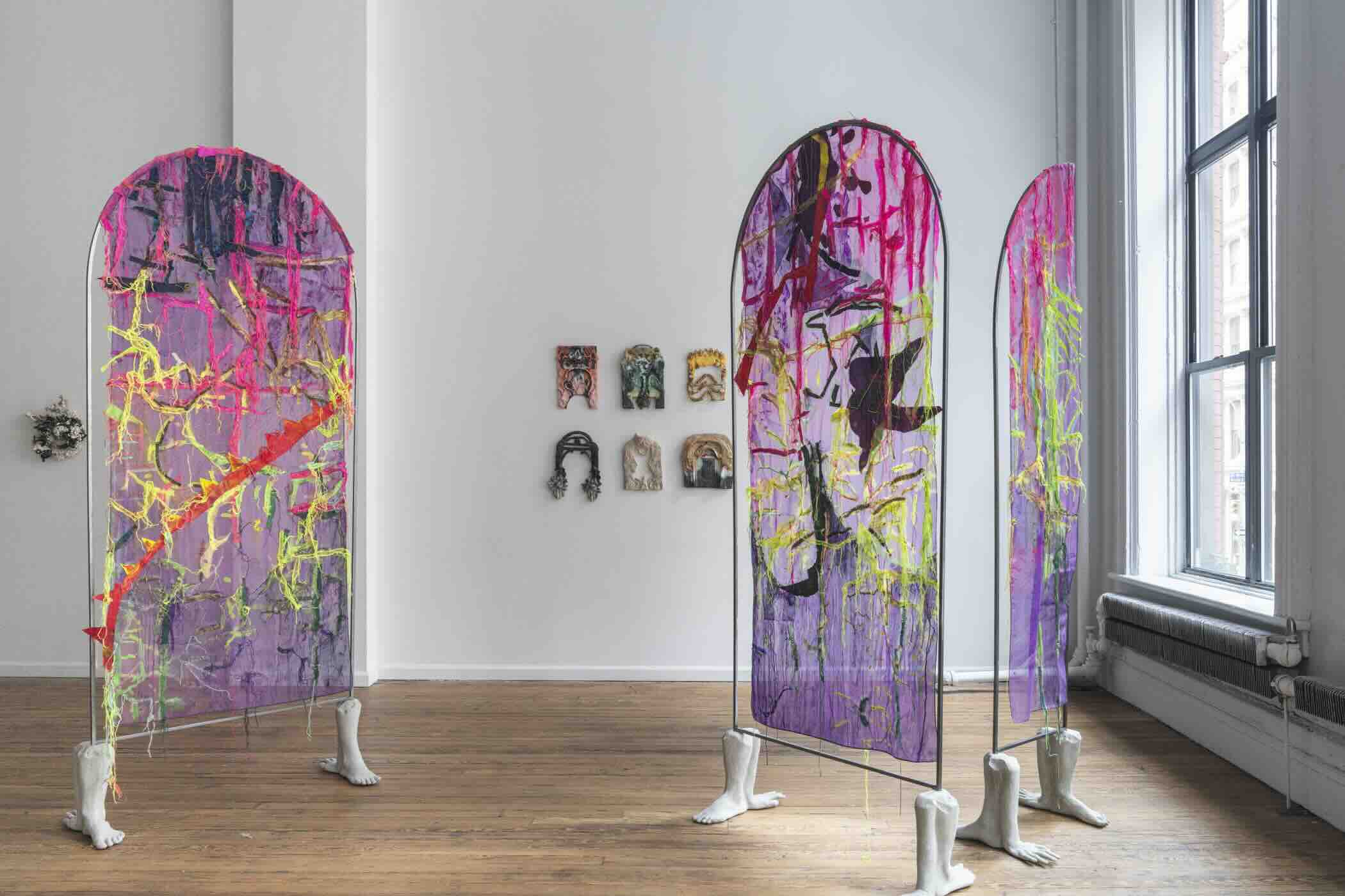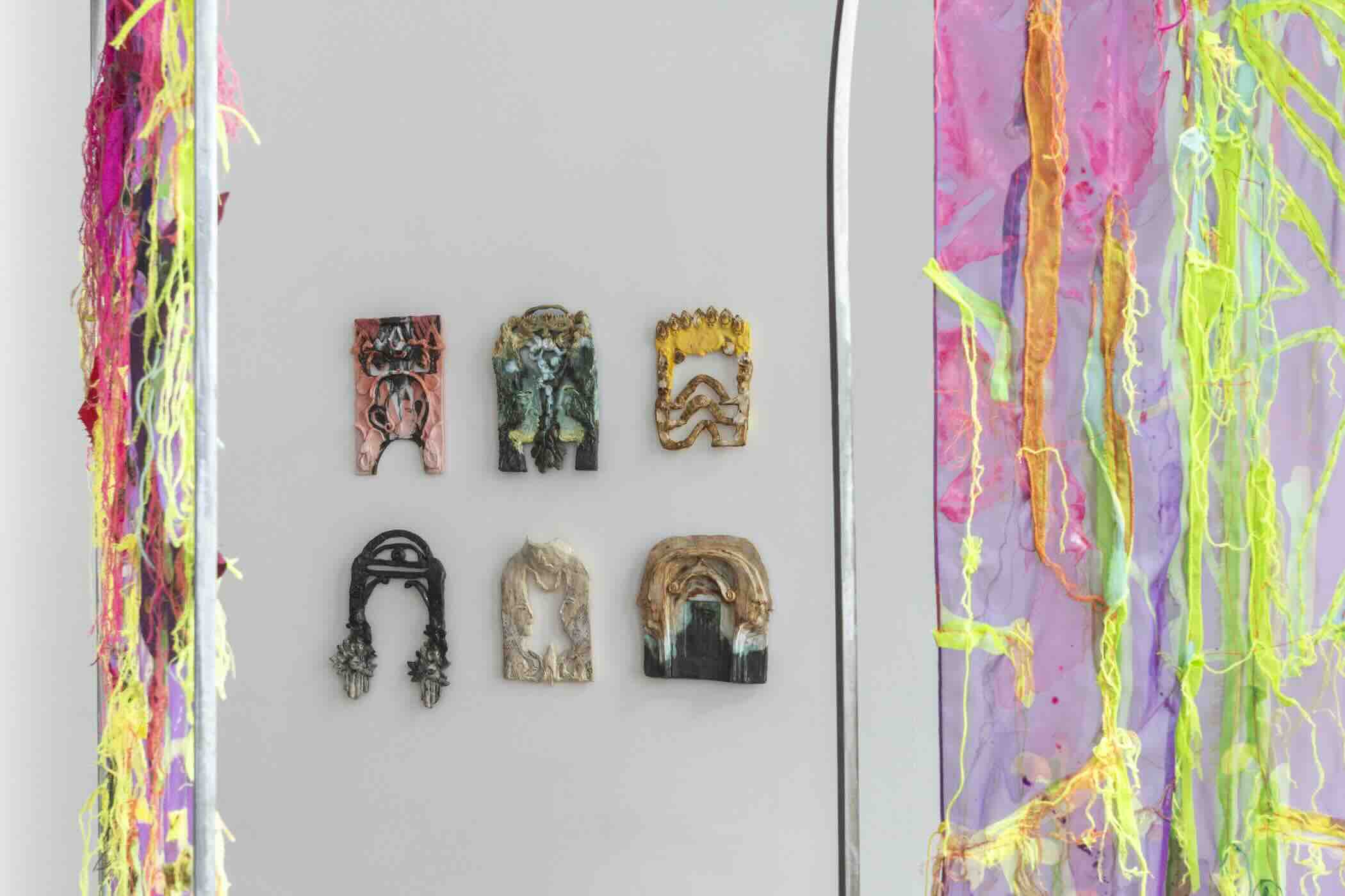 Along the gallery walls, Jimenez presents new ceramic works. Some pieces reference bodies that resemble landscapes; others take the form of archways or doorways, embedding body parts and intricate ornamentation in suggestions of architecture. For Jimenez, the arch or doorway is at once boundary and threshold, space and passage, marking liminal moments of transformation.